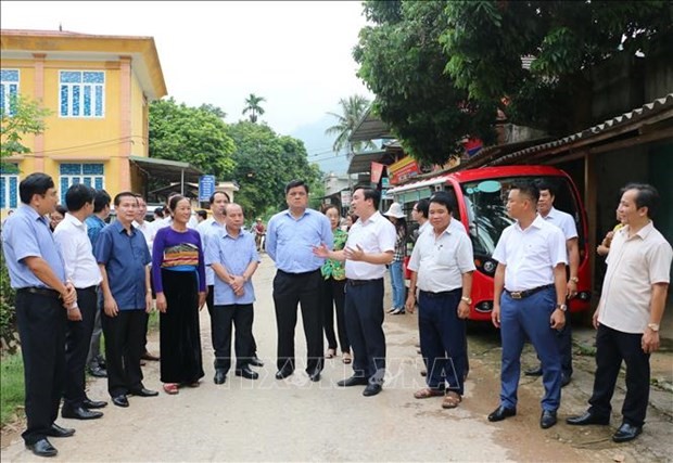 Thứ trưởng Bộ Nông nghiệp và Phát triển nông thôn Trần Thanh Nam cùng lãnh đạo tỉnh Hòa Bình và huyện Mai Châu trao đổi về Chương trình OCOP tại bản Nhót, xã Nà Phòn, huyện Mai Châu. Ảnh: Vũ Hà - TTXVN