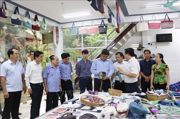 Thứ trưởng Bộ Nông nghiệp và Phát triển nông thôn Trần Thanh Nam cùng lãnh đạo tỉnh Hòa Bình và huyện Mai Châu thăm điểm giới thiệu và bán sản phẩm OCOP tại bản Lác, xã Chiềng Châu, huyện Mai Châu. Ảnh: Vũ Hà - TTXVN