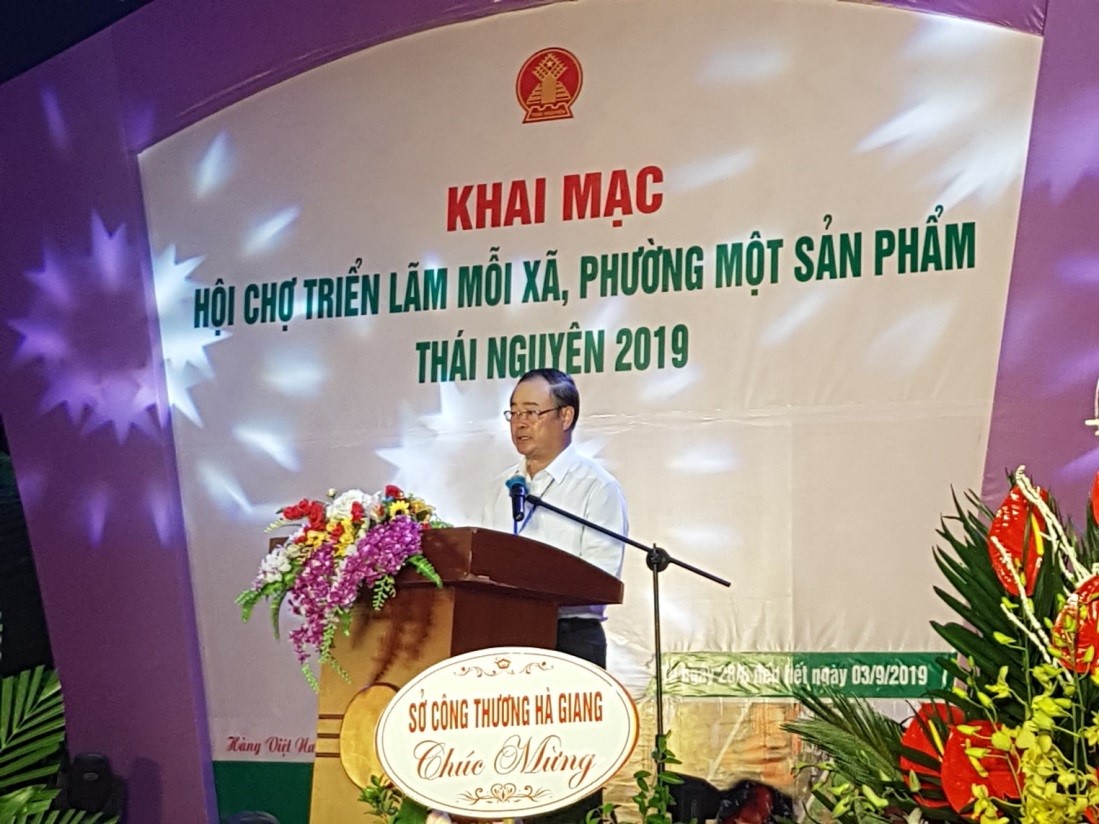 Ông Nhữ Văn Tâm phát biểu tại buổi lễ khai mạc hội chợ OCOP Thái Nguyên 2019