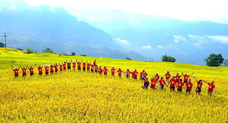 Du khách trải nghiệm ruộng bậc thang xã Hồng Thái (Na Hang). Ảnh: KT